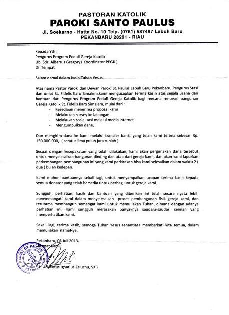 Surat Resmi Ucapan Terima Kasih Penerimaan Bantuan dari Paroki Labuh Baru, Pekanbaru |