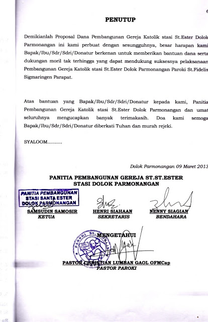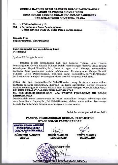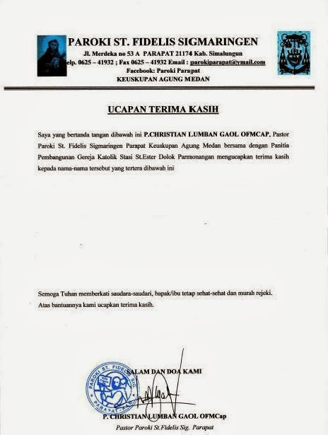 Surat Resmi Ucapan Terima Kasih Penerimaan Bantuan dari Paroki Simpang Dua, Ketapang |