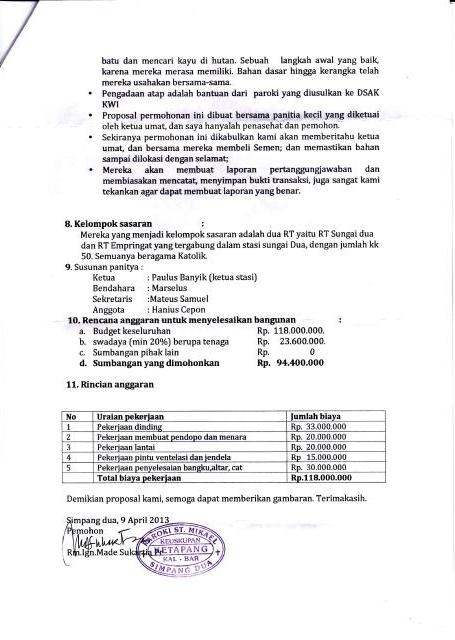 Dana yang masuk melalui Rekening PPGK di atas telah kami transfer ke Rekening Paroki Simpang Dua sebesar Rp 98.000.000 pada tanggal 15 Agustus 2013 (bukti transfer terlampir).