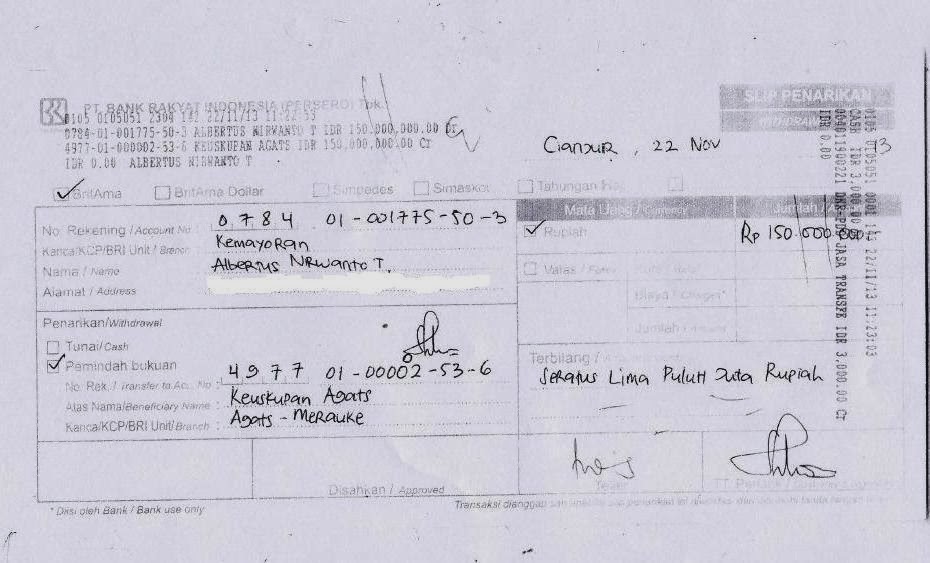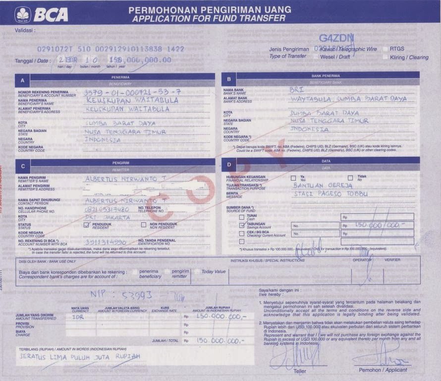 Bukti Transfer Dana Bantuan untuk Paroki Karuni sebesar Rp 150.000.000,00. |