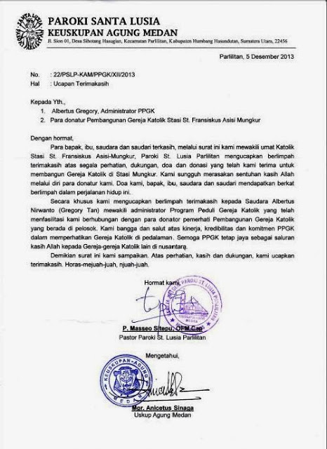 Surat Resmi Ucapan Terima Kasih Penerimaan Bantuan dari Paroki Parlilitan, Humbang Hasundutan |