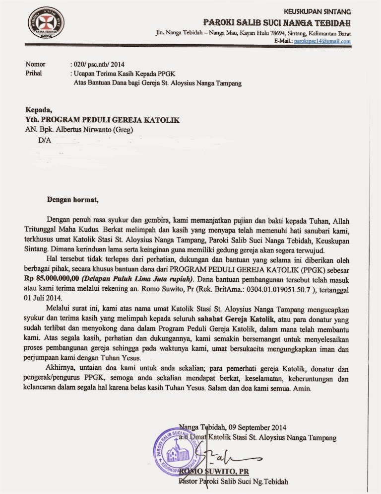 Surat Resmi Ucapan Terima Kasih Penerimaan Bantuan dari Paroki Nanga Tebidah, Sintang, Kalimantan Barat |