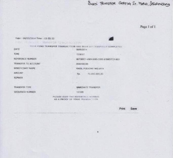Bukti Transfer Dana Bantuan untuk Paroki Aek Kanopan sebesar Rp 200.000.000,00. |