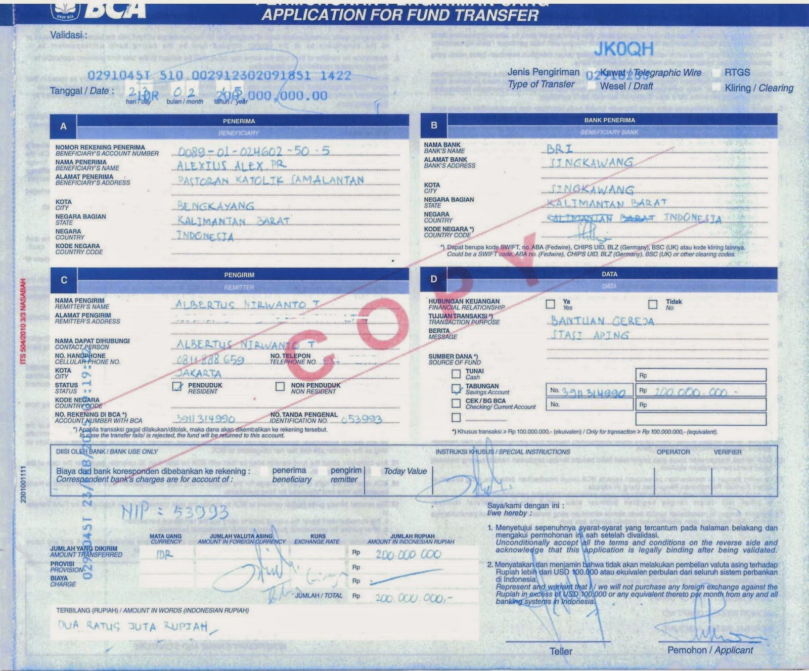 Bukti Transfer Dana Bantuan untuk Paroki Samalantan sebesar Rp 200.000.000,00 |