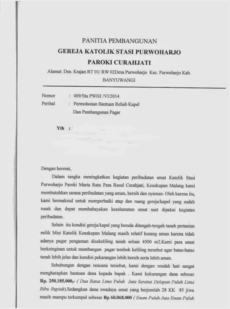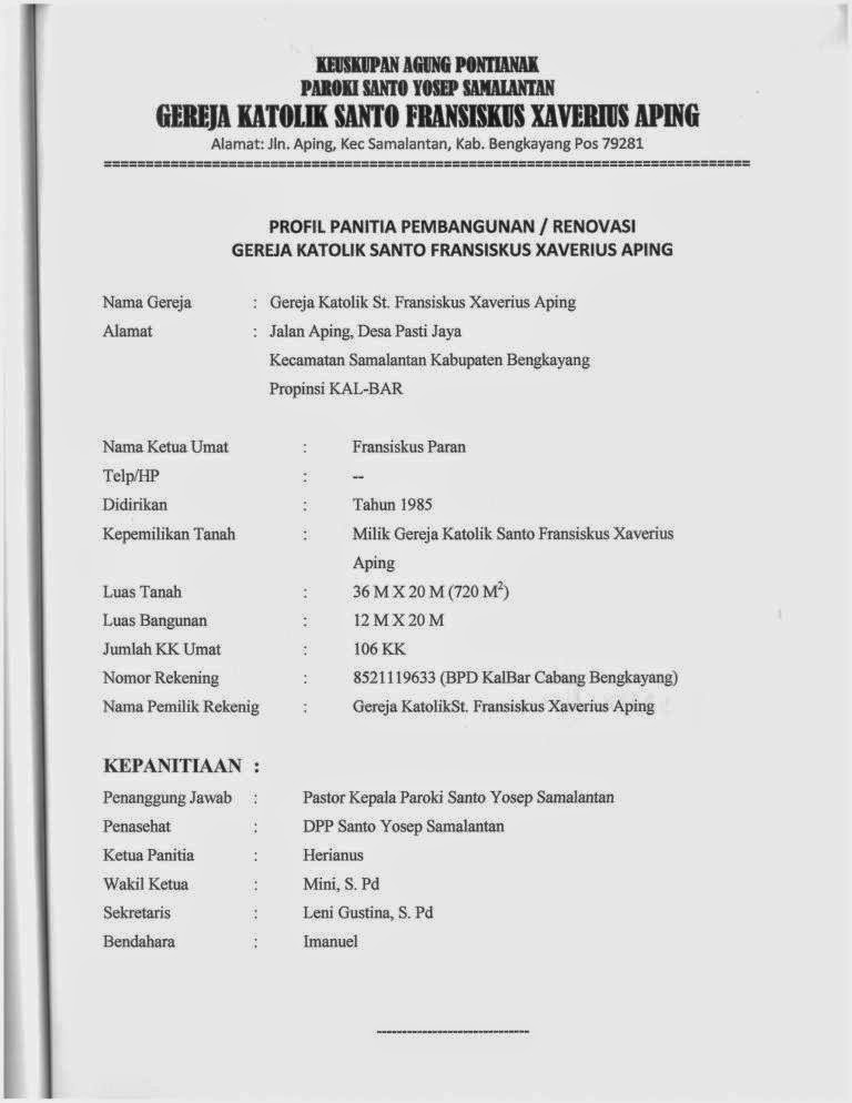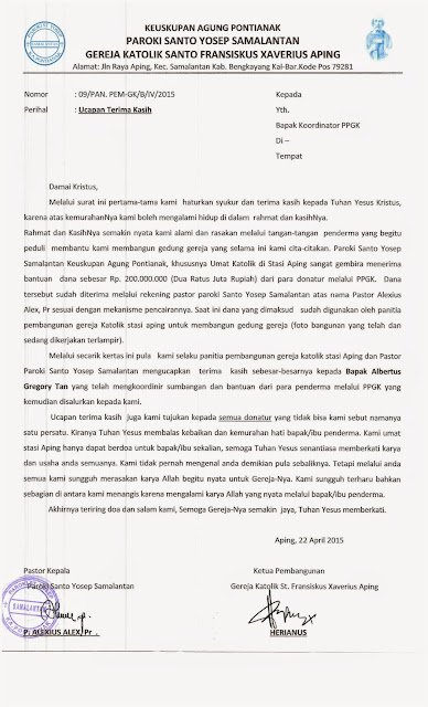 Surat Resmi Ucapan Terima Kasih Penerimaan Bantuan dari Paroki Samalantan, Bengkayang, Kalimantan Barat |