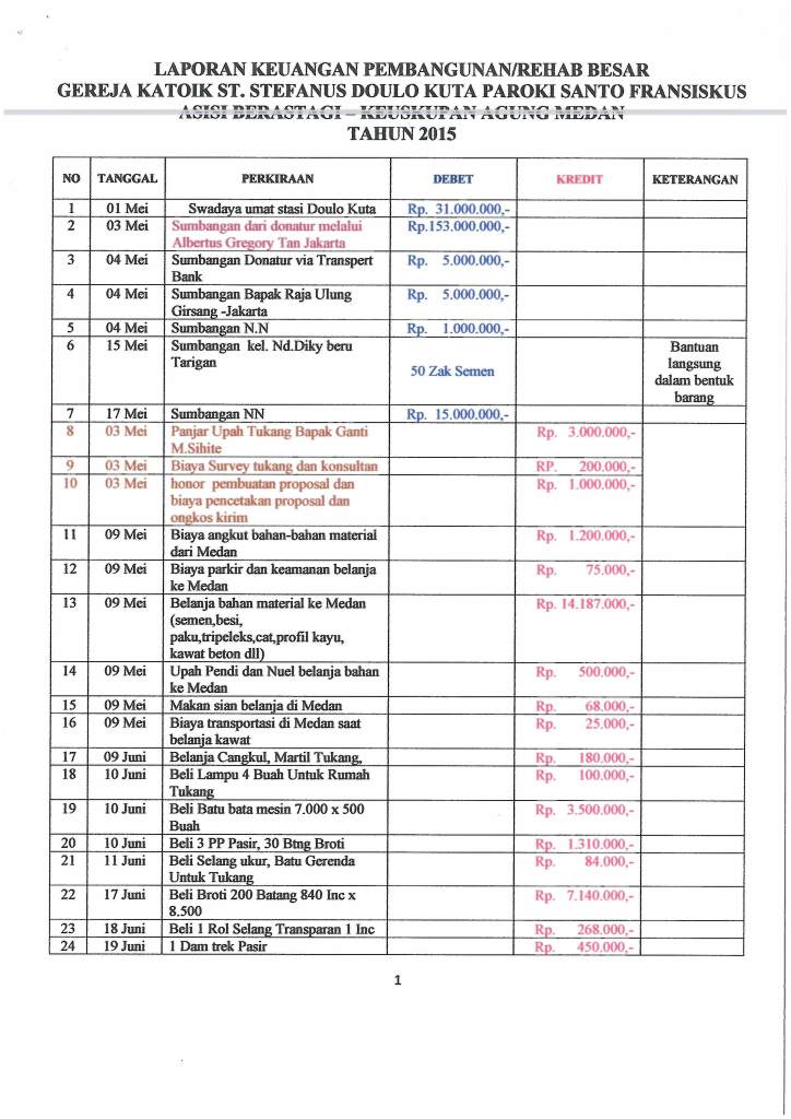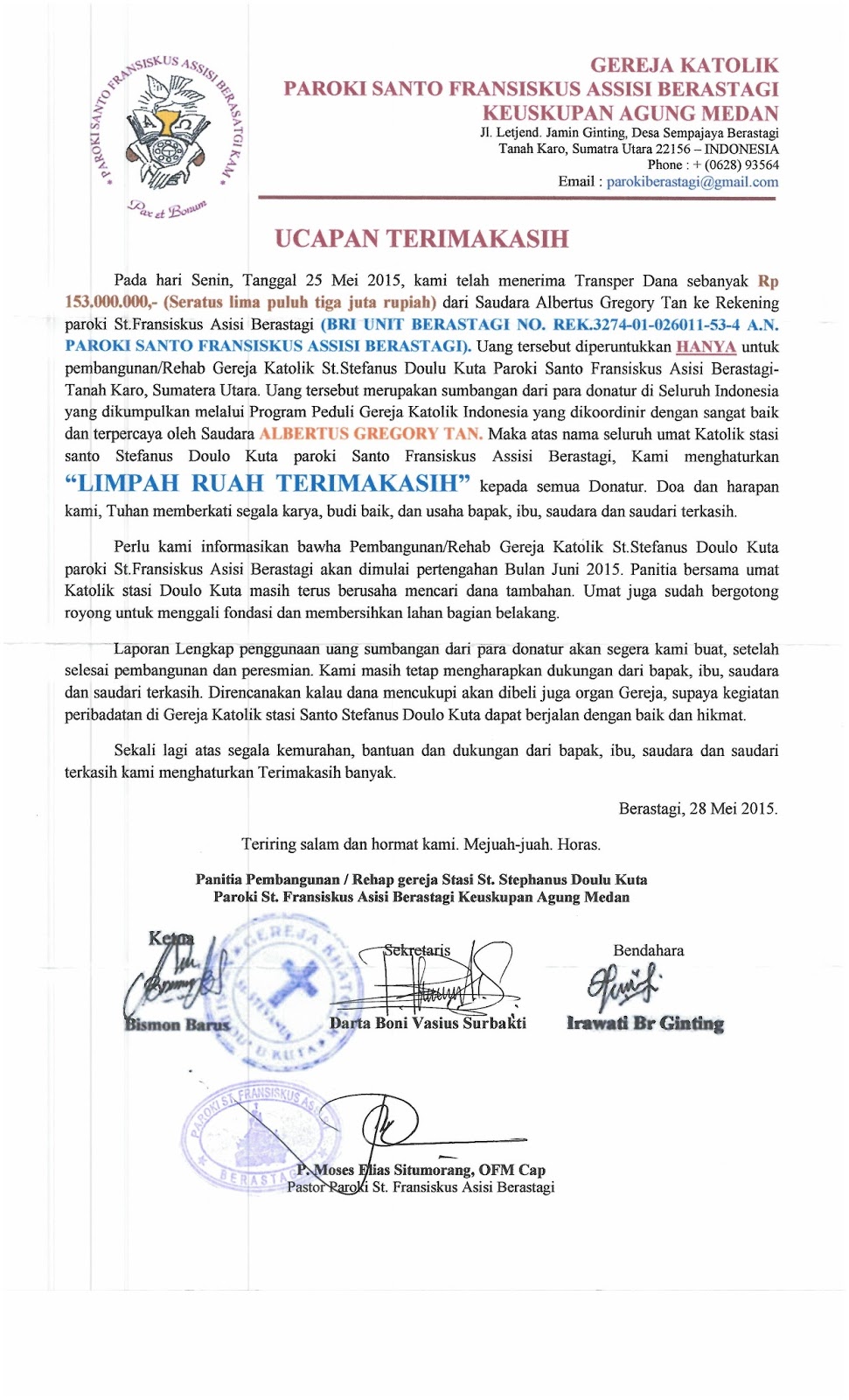 Dana yang masuk melalui Rekening PPGK di atas telah kami transfer ke Rekening Paroki St. Fransiskus Assisi, Brastagi (BRI a/n Paroki Santo Fransiskus Assisi Brastagi) sebesar Rp 153.000.000 pada tanggal 26 Mei 2015 (bukti transfer terlampir).