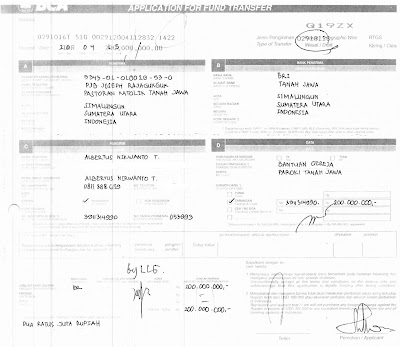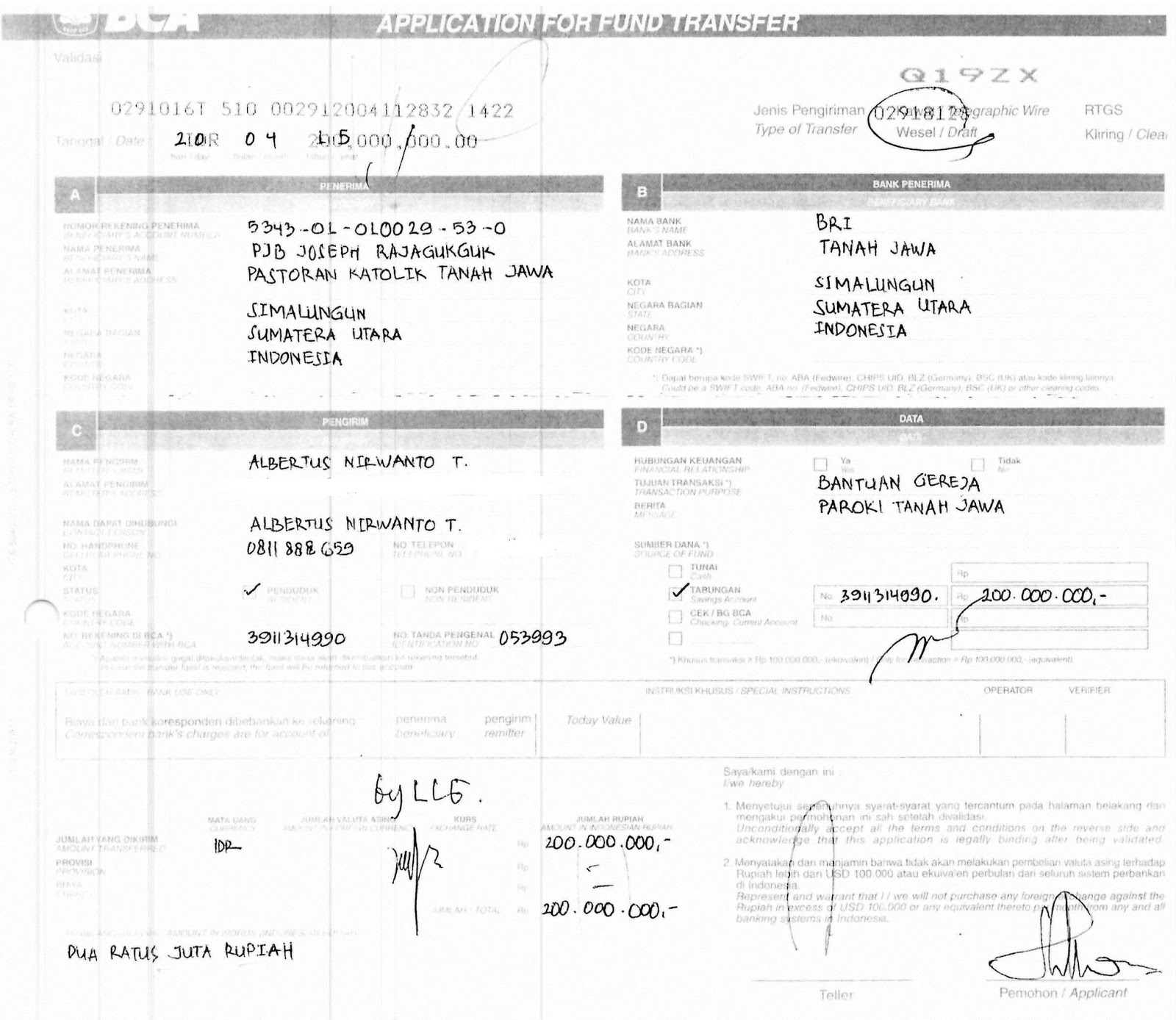 Bukti Transfer Dana Bantuan untuk Paroki Berastagi sebesar Rp 153.000.000,00 |