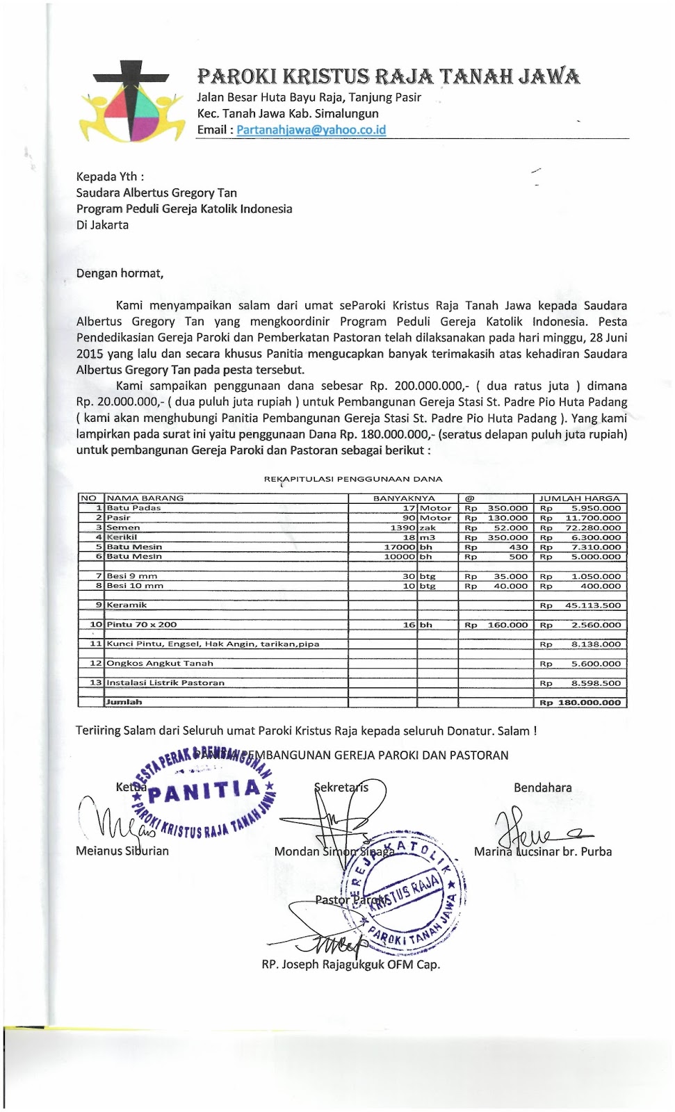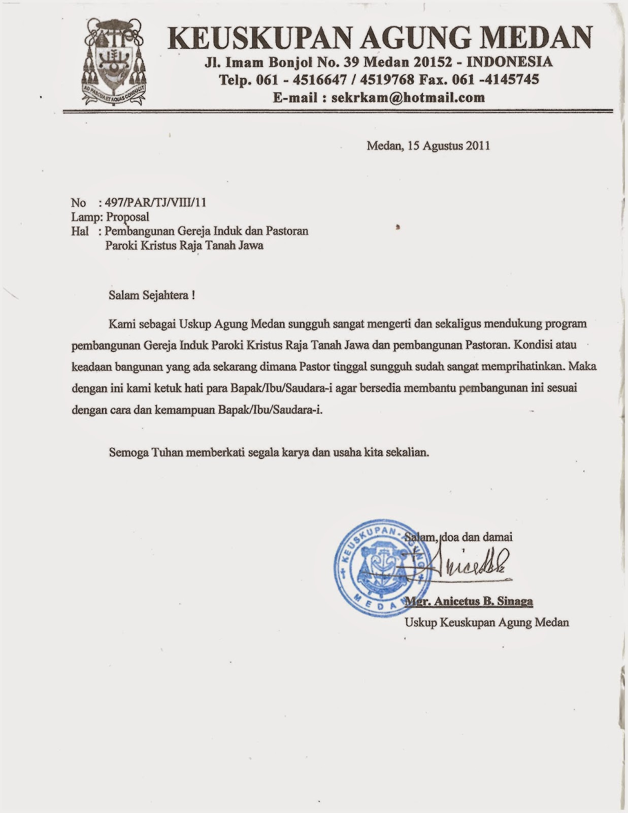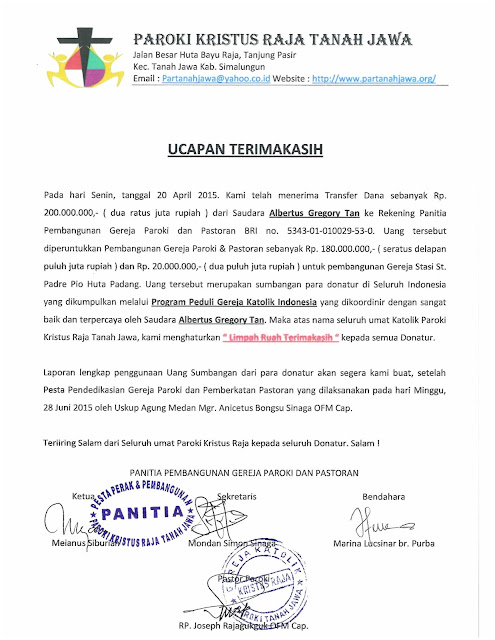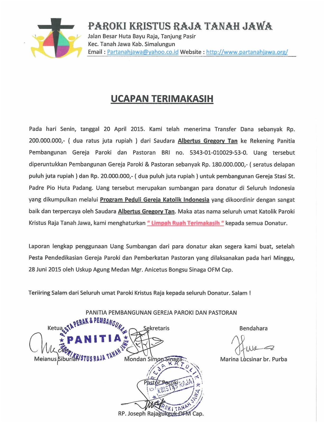 Surat Resmi Ucapan Terima Kasih Penerimaan Bantuan dari Paroki Berastagi, Karo, Sumatera Utara |