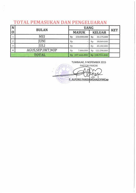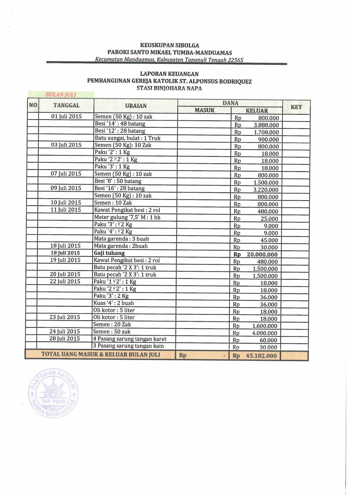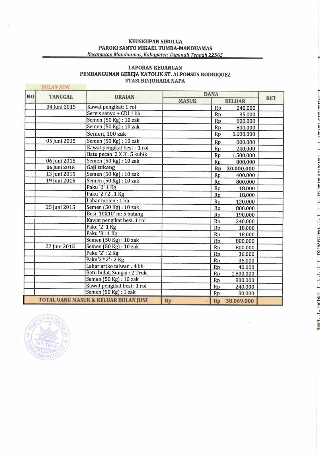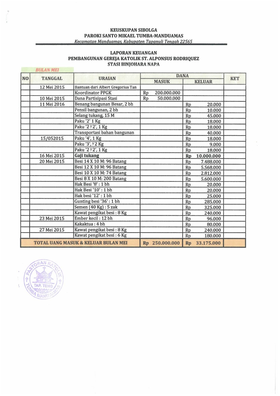 Syukur kepada Allah atas terselesaikannya kegiatan pencarian dana untuk Gereja Katolik St. Alfonsus Rodriguez, Binjohara Napa, Tapanuli Tengah, Keuskupan Sibolga. Jumlah total dana bantuan yang terkumpul adalah sebanyak Rp 203.261.224,- dengan rincian sebagai berikut: