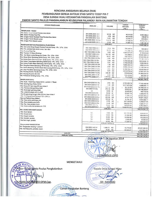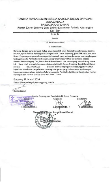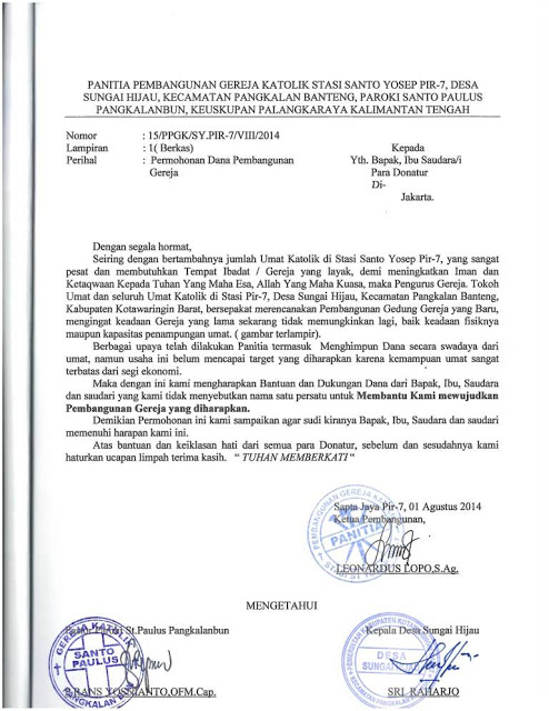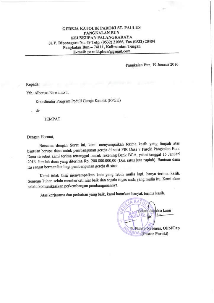 Ucapan Terima kasih dari Gereja St. Paulus, Pangkalan Bun atas bantuan untuk stasi PIR 7 |