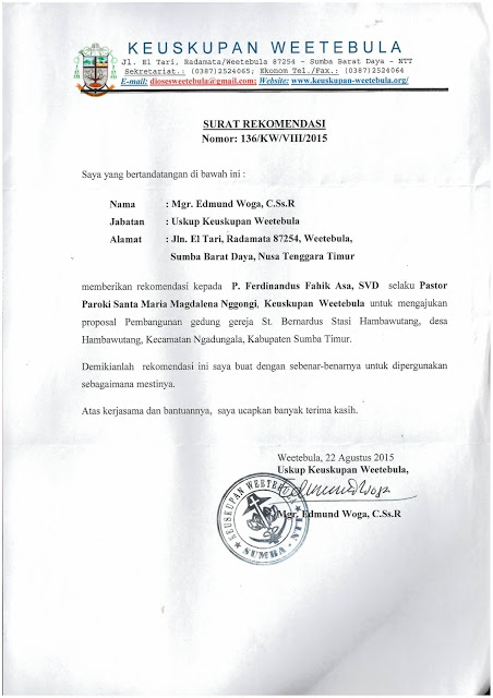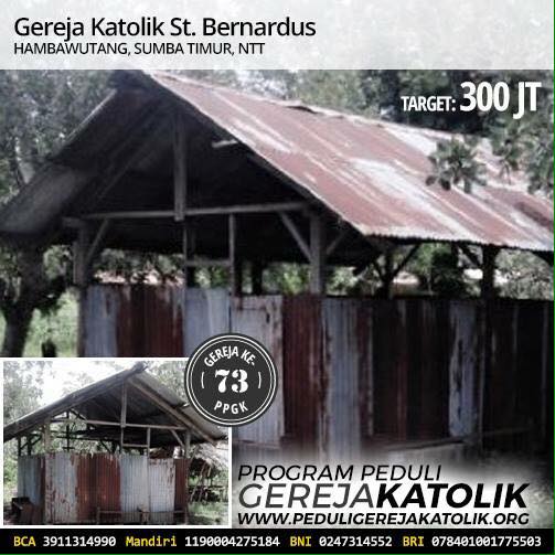 Siapa kira bahwa bangunan darurat mirip kandang ini adalah sebuah gereja mungil di Desa Hambawutang, Kec. Ngadungala, Sumba Timur, NTT. Gereja dengan nama pelindung St. Bernardus ini merupakan salah satu stasi dari Paroki St. Maria Magdalena, Nggongi, Keuskupan Weetebula. Paroki Nggongi berjarak sekitar 200 km / 5 jam perjalanan dari Kota Waingapu, Sumba Timur. Berdiri pada tahun 1989, stasi ini kini memiliki jumlah umat sekitar 175 jiwa, semuanya bermatapencaharian sebagai petani. Kehidupan umat yang sangat memprihatinkan dari sisi ekonomi tidak memungkinkan untuk membangun sebuah tempat ibadat yang layak. Kondisi gereja saat ini memang sangat darurat. Tidak perlu dijelaskan dengan banyak kata, silakan dilihat dalam foto, maka sudah terlihat jelas daruratnya gereja ini. Terlebih ketika musim hujan tiba, misa tidak dapat dirayakan karena gereja berlantai tanah ini tergenang air. Pertumbuhan dan perkembangan iman Katolik di stasi ini cukup pesat terutama perpindahan dari keyakinan tradisional, Marapu. Banyak umat Marapu beralih ke Gereja Katolik karena melihat banyaknya kesamaan dan kemiripan dalam ajaran Gereja Katolik. Maka stasi ini menjadi salah satu ladang evangelisasi yang cukup subur. Mungkin stasi ini akan tetap seperti ini jika kita tidak memulai untuk menyemangati dan membangun bersama mereka. Apakah kita mau terlibat?